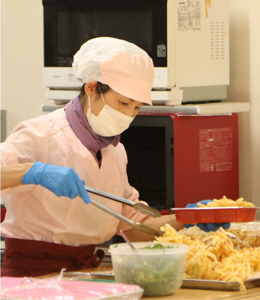 この仕事に就くのは初めてで、解らないことや知らないこ とがたくさんありますが、先輩の職員から、一つ一つ教えても らいながら、園生の皆さんにおいしく元気の出る料理を作っています。